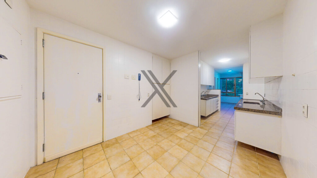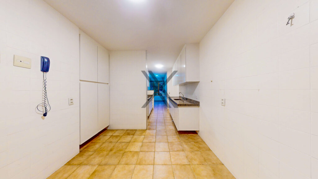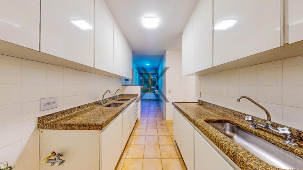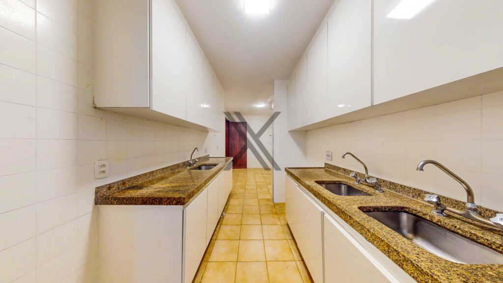 A cozinha, além de possuir grandes áreas de bancada, conta com uma excelente quantidade de armários sob medida e ainda possui duas dependências completas para funcionários.