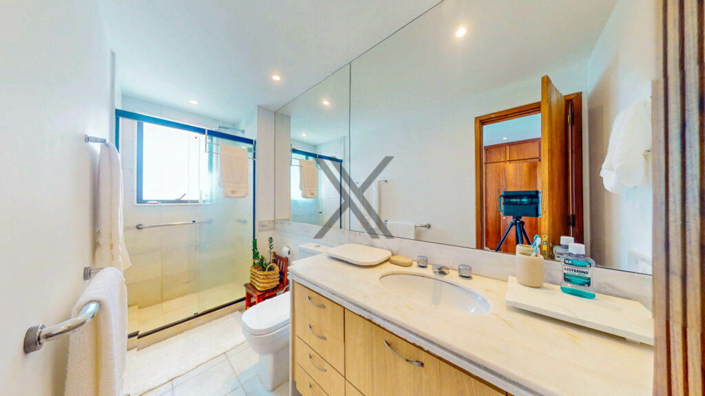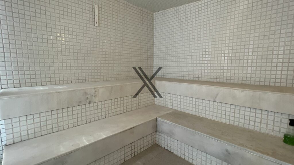 Na parte privativa, o imóvel possui 2 quartos, sendo uma suíte ampla, com vista para o mar e belo banheiro com ventilação natural. O outro quarto também conta com vista para o mar e com uma grande quantidade de armários. O piso da área privativa é todo em Durafloor.