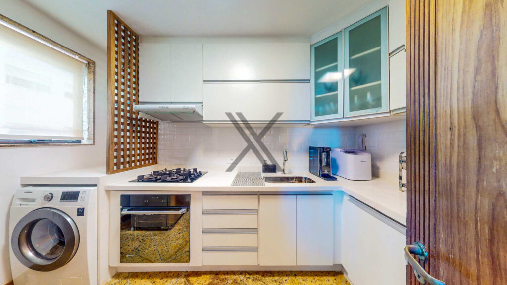 O imóvel é composto por uma sala de estar de 30 m², contando com piso em granito na área social, por uma ampla sala de jantar para 4 lugares e por uma cozinha com grande quantidade de armários, bancadas e com uma excelente área de serviço com espaço para máquina de lavar.