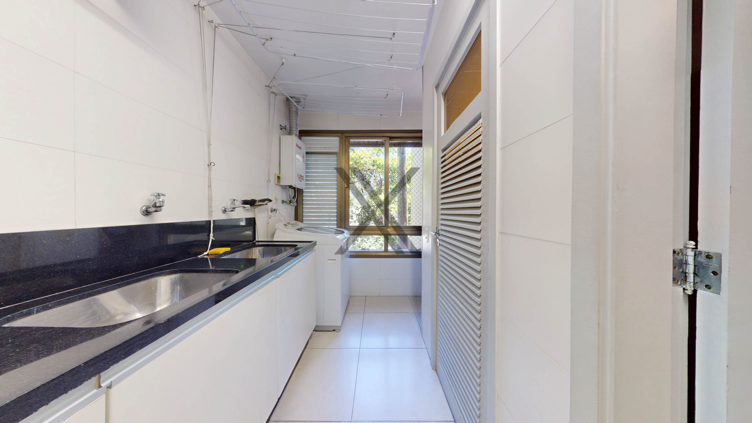 A cozinha, além de possuir grandes áreas de bancada, conta com bastante espaço de armazenagem e copa de apoio para pequenas refeições. Em anexo, área de serviço com duas dependências completas para funcionários.