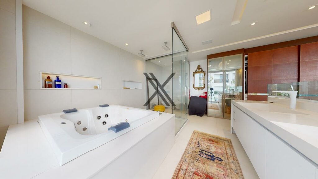 - Suíte master com grande quantidade de armários e ampla sala de banho com hidromassagem.